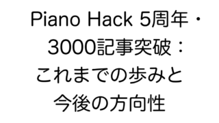 · ブログ運営 Piano Hack 5周年・3000記事突破:これまでの歩みと今後の方向性 2026年4月に5周年を迎えるピアノ学習メディア「Piano Hack | 大人のための独学用Webピアノ教室」が、3000記事突破を機にサイトの歩み・運営方針・コンテンツの特徴を総まとめ。独学支援に特化した運営理念や、大型コンテンツの紹介もあわせて掲載します。 2026.03.25 · ブログ運営
